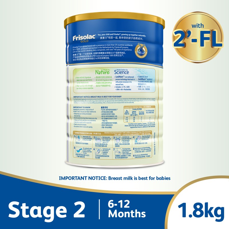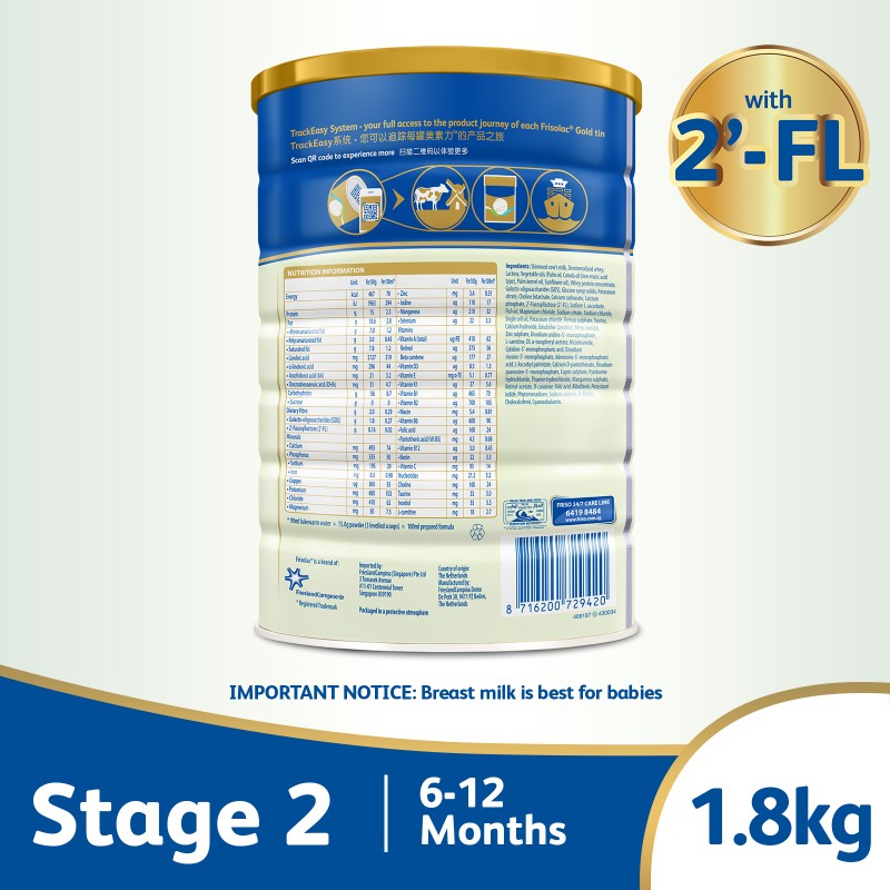 Frisolac Gold Stage 2 with 2'-FL 1.8kg - Follow-On Milk Formula Powder - For Infant / Newborn / Baby 6-12 months old (Bundle of 6)
