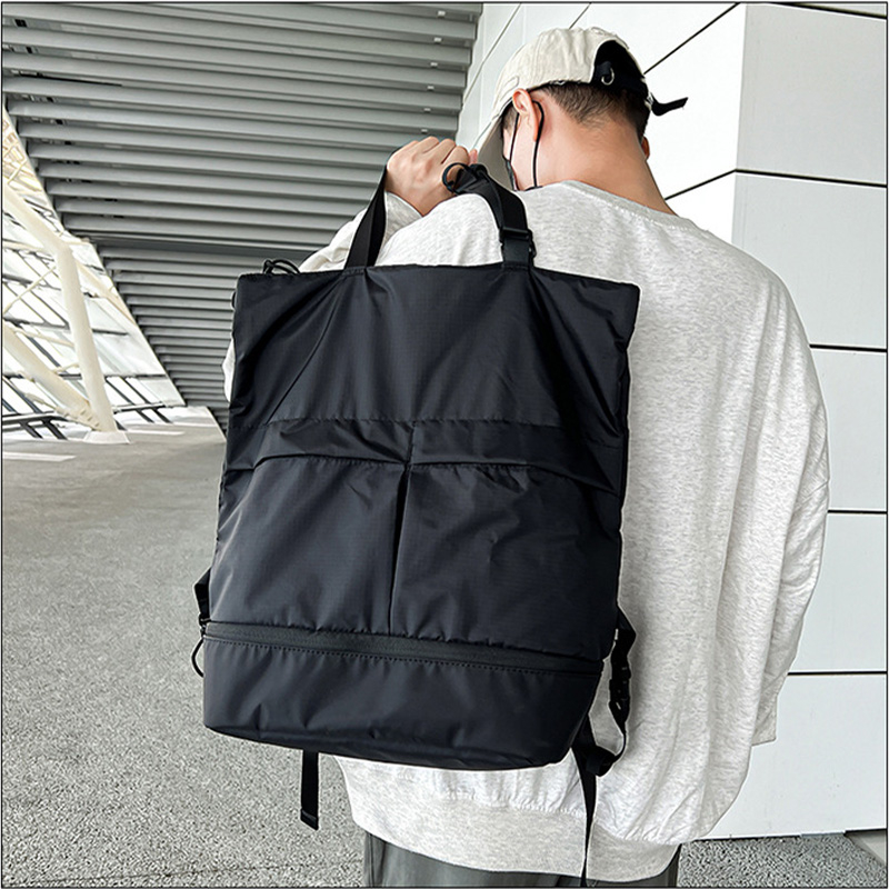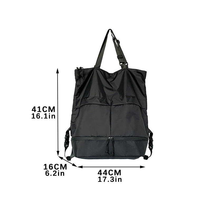 Durability:looks good Material:nylon, light weight The bag can use as backpack, hand carry or shoulder carry. It's 40cm x 44cm, I remember the same bag at Uniqlo is bigger a bit, still the size is acceptable, can put a lot of things, I wish it can be bigger a bit tho. It is light weight since it made by nylon. Friendly reminder: I ask question to the seller and they rarely respond. So be warned about that.
