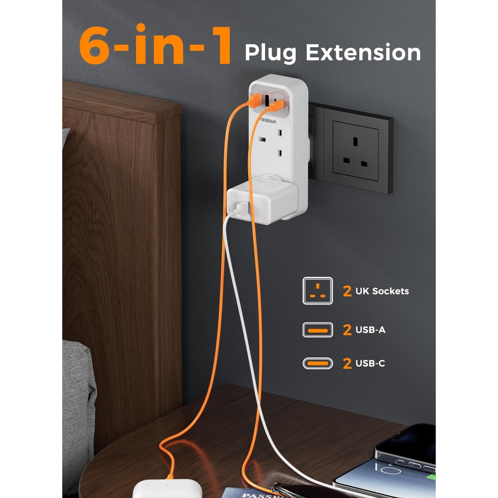 TESSAN Multi Plug Extension Adapter with USB and Type C,2 Way Power Extension Socket Wall plug